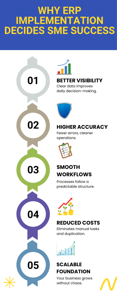 Successful ERP implementation for SMEs is not a matter of luck. It requires careful planning, disciplined execution, and the right support. By focusing on preparation and structured steps, businesses can ensure their ERP delivers the intended benefits, automation, accuracy, and efficiency, without disruption.