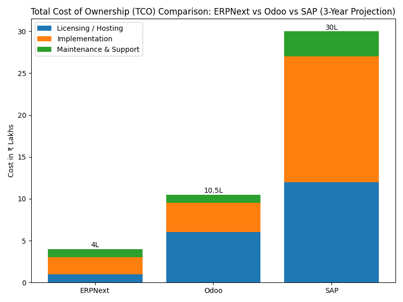 The chart below aggregates Licensing, Implementation, and 3-year Maintenance costs for ERPNext, Odoo, and SAP, providing a clear picture of total cost differences. Each bar shows the total 3-year TCO: