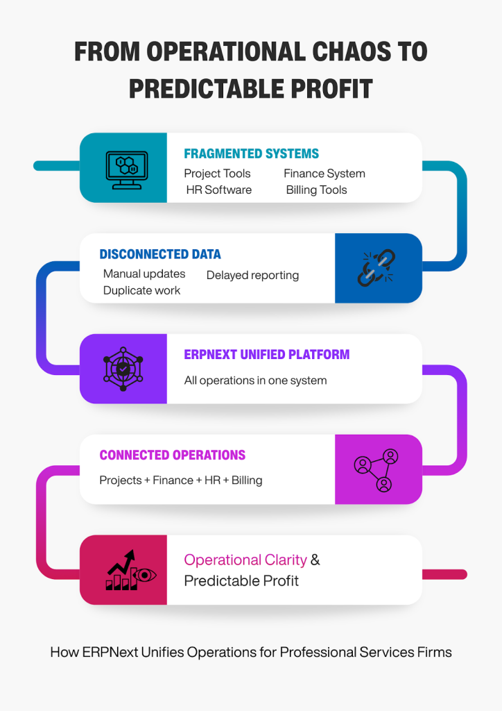 Professional services firms perform best when delivery, workforce management, and financial operations move in alignment. ERPNext enables this synchronization by converting daily operational challenges into measurable performance improvements.