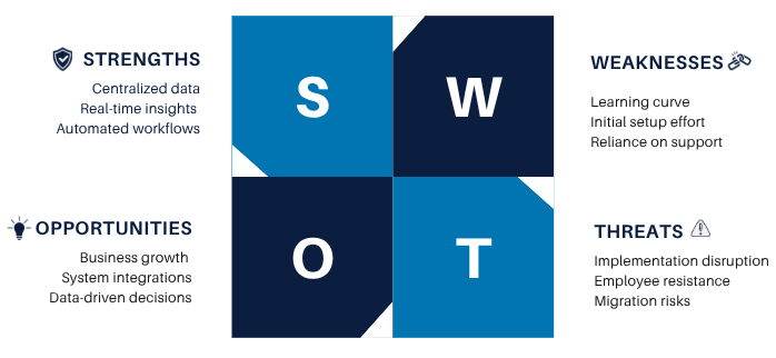 A clear understanding of the client’s strengths, weaknesses, opportunities, and threats helps us deliver a tailored ERP solution that drives efficiency and growth.